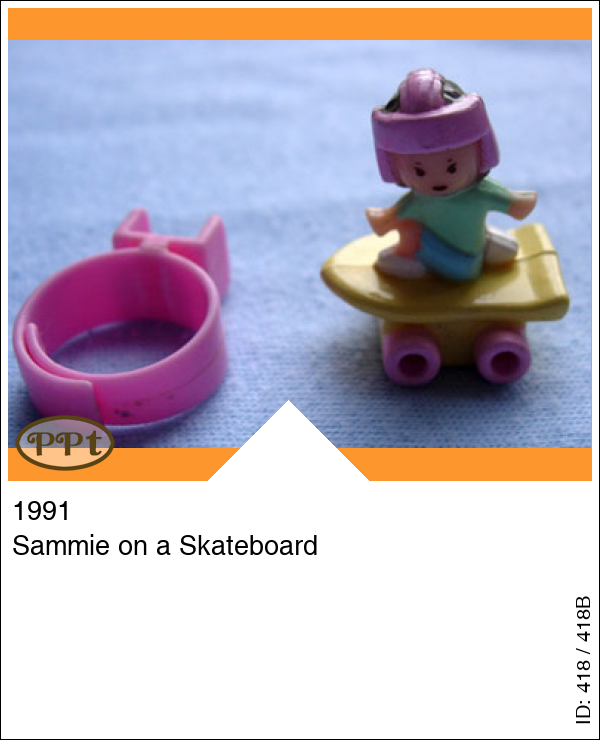 Sammie on a SkateboardUpdate: 21-02-2023 Dit is Sammy op zijn skatebord, hij zit alleen wel vast erop je kunt alleen de ring loshalen, en het losse lila surfplaatje.