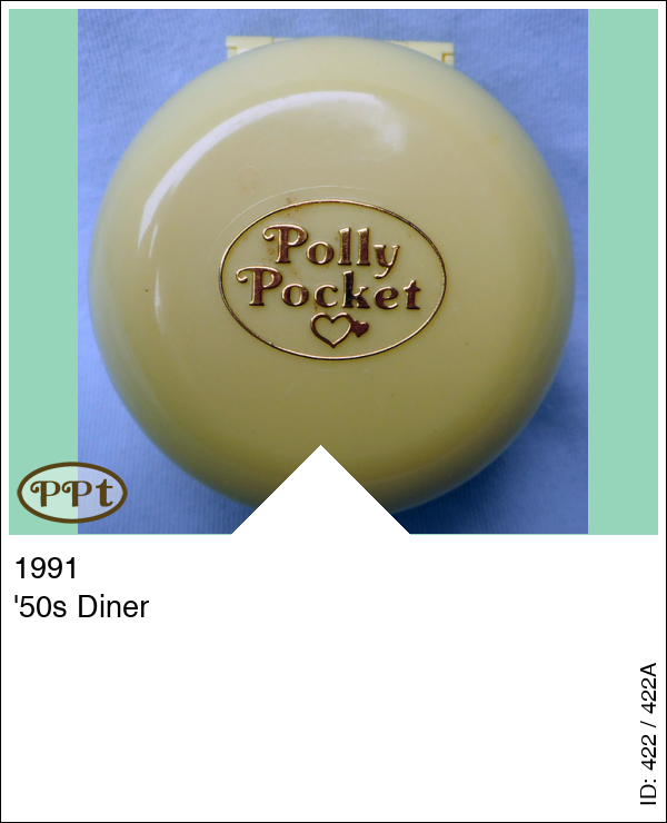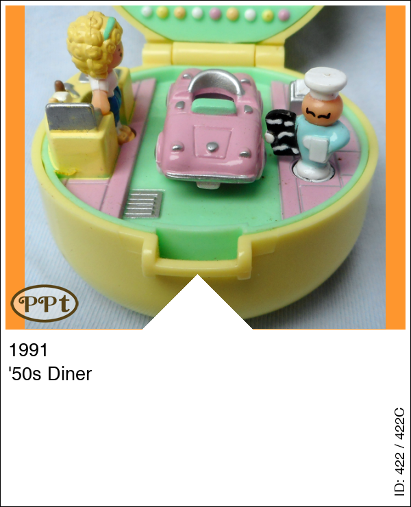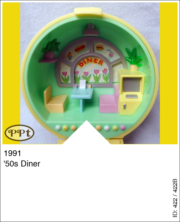 Dit ronde gele hoge doosje is van binnen een drive-in restaurant met zithoek en kassa. Hier hoort een ring in het midden met een roze auto en dan kan je bestellen. Met Polly en de chefkok met het menubord in zijn hand, roze auto, groene ring.
