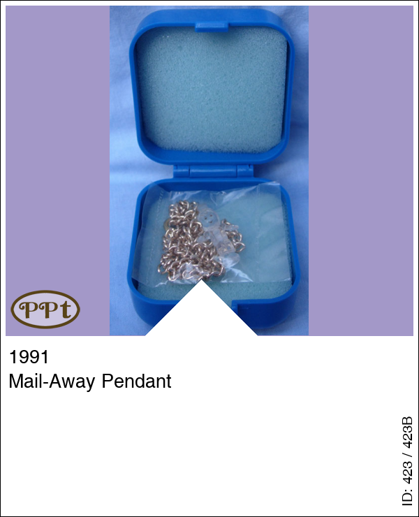 Mail-Away PendantUpdate: 21-02-2023 Uniek doosje met binnen in een halsketting met daaraan Polly in doorzichtig glas.