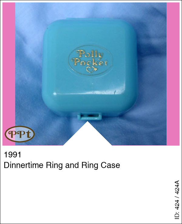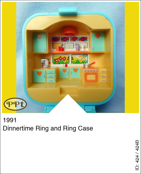 Een blauw vierkant hoog doosje met binnenin een keukentje en aan de andere kant staat de eettafel met lekkere dingen en dat is tevens een ring. Met polly in rode jurk, het bruine staande hondje, en de groene ring.
