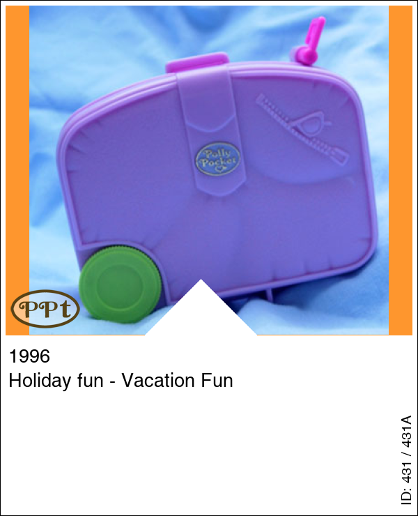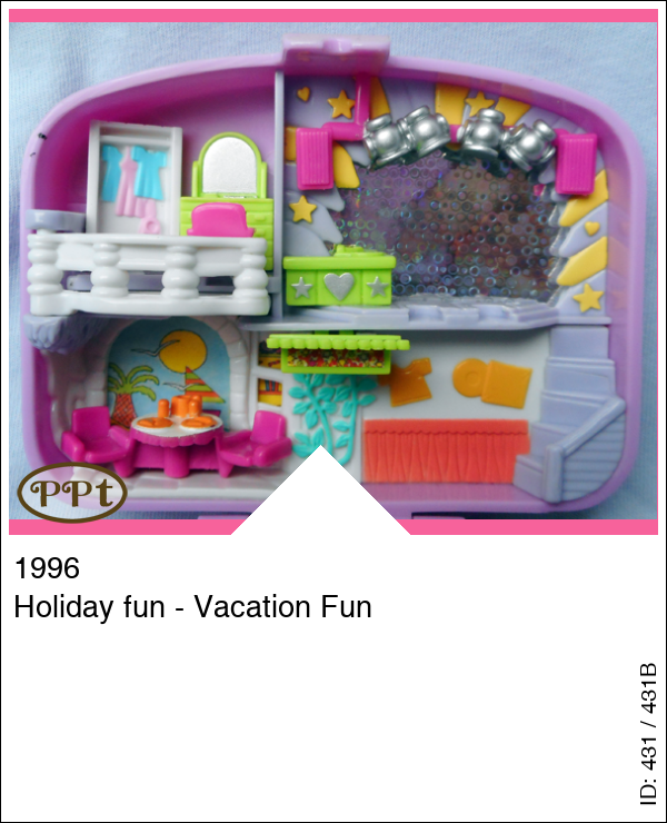 Een leuk paars koffertje met binnenin een zwembad aan de zee met een zandstrand en daar ligt een hoopje zand waar een popje in kan liggen, een rotspartij welke open kan en daaronder ligt een krab, bij het zwembad heb je een duikplank en polly kan echt in het water, in het water ligt een luchtbed. Bovenin is haar hotelkamer met kast waar je tevens een bed van kan maken als je het balkon opzij klapt, er staat een kaptafel. Je ziet de bar met los zitje en een disco met glitterwand. Met Annie met fototoestel in haar hand, Polly met zonnebril en stickertjes.
