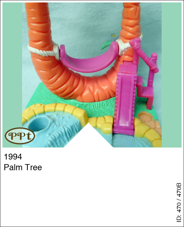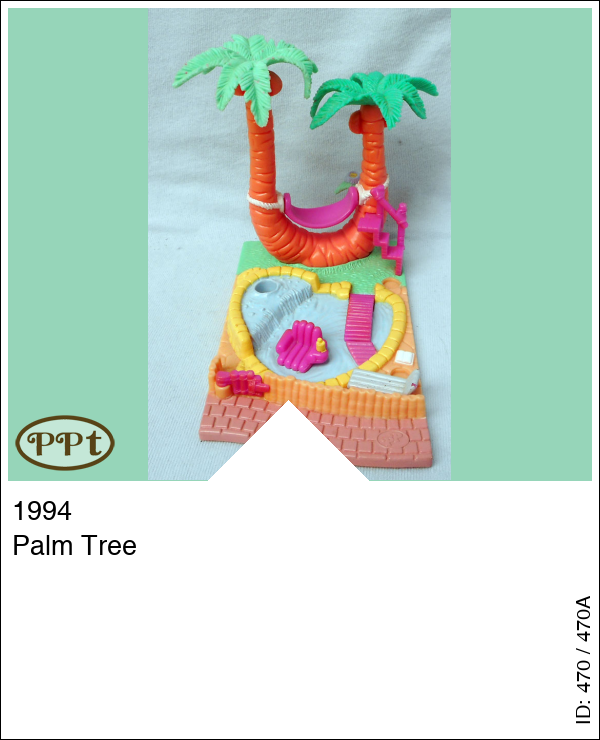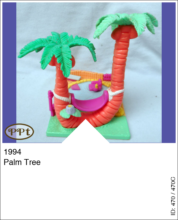 Dit is een eiland met een zwembadje en palmbomen. In de bomen hangt een hangmat en die beweegt echt. De stoel in het zwembad draait en het bruggetje kan omhoog. Polly kan ook in het zwembad zitten. Met Polly en paarse fiets.