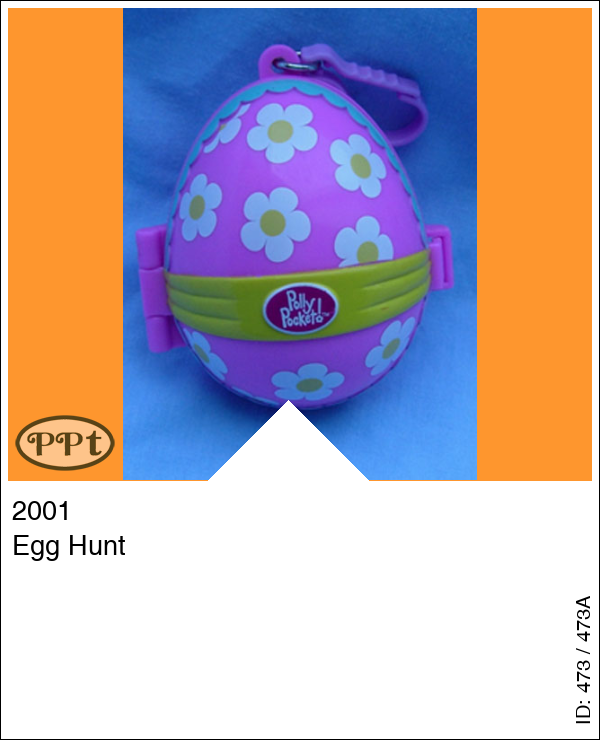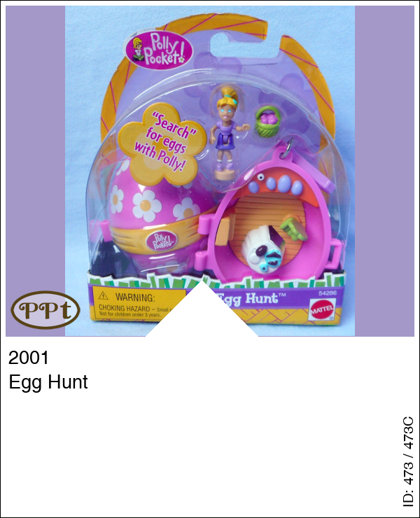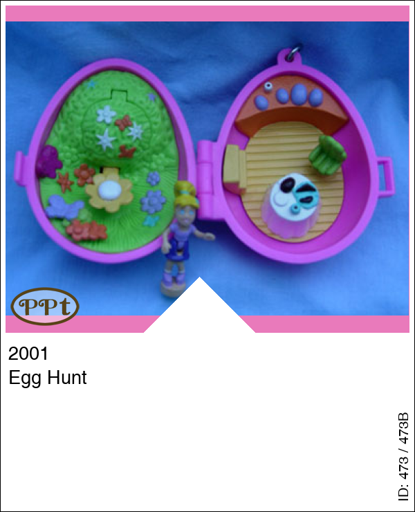 Een ei met een mooie strik eromheen en bloemen erop. Binnen is een tafel met stoelen, en je ziet een grasveld met bloemen en vlinders. Als je op de gele bloem duwt dan komen er kuikentjes tevoorschijn onder het gras. Met Polly en het groen mandje met eitjes.