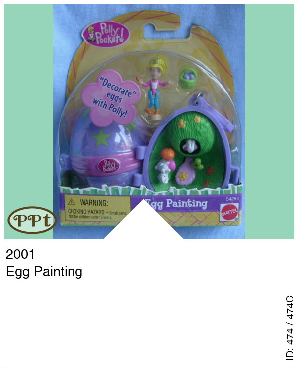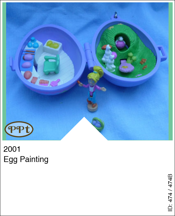 Een lila ei met een strik en sterren erop. Binnen is een stoel en een schildertafel om eieren te schilderen. Aan de andere kant zie je een grasveldje met paddestoeltjes en 2 konijntjes. Als je op het paarse stukje duwt komt er een ander konijntje met ei tevoorschijn. Met Polly en een mandje met eitjes.