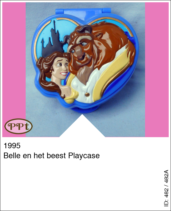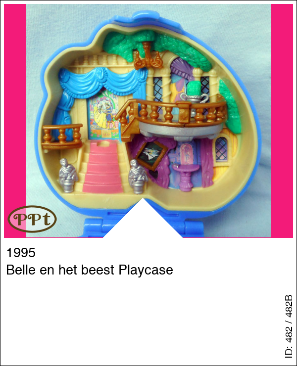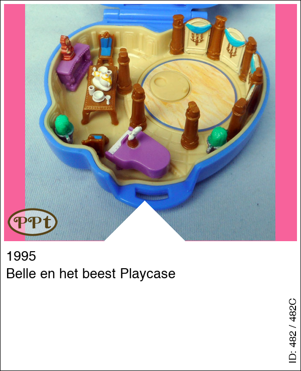 Dit is een doosje met voorop Belle en het Beest. Binnen zie je beneden de danszaal met bewegende dansvloer en een piano hierop staat Lumiere (kandelaar), een tafel met daarop mevr. Tuit en Chip en een open haard met Pendule (klok). De andere kant is de trap in het kasteel met balkon en onder het balkon zie je de roos onder de stolp. Met Belle en het beest.