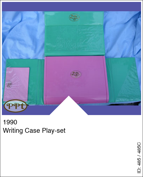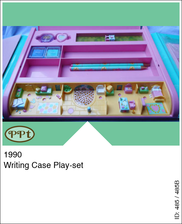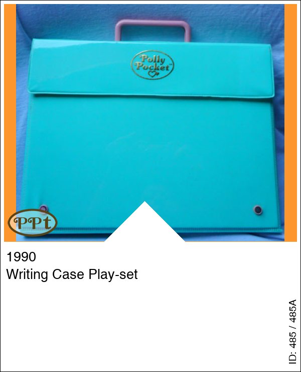 De groene koffer met binnenin de writing-case Als je deze doos open doet dan zie je op de deksel een 16 tal soorten poppetjes die er zijn in de collectie pp, compleet met naam, en ook 9 soorten diertjes, deze hebben geen naam. Verder zitten er vakjes in voor potloden, lineaal, gum, puntenslijper enz. en aan de voorkant kun je spelen met Polly pocket, want daar zie je een slaapkamer met allerlei wasgoed op de vloer, nog een slaapkamer maar deze is netjes, een schrijfkamer met toilettafel en tv en poesje en dan heb je nog een ruimte buiten met steentjes vloer en een auto op de achtergrond. Met baby en Polly met blauw petje op, Titch, Tiny Tina, Minny, 2 potloden, gum, puntenslijper, papier en envelop met logo van Polly pocket.