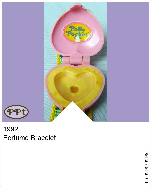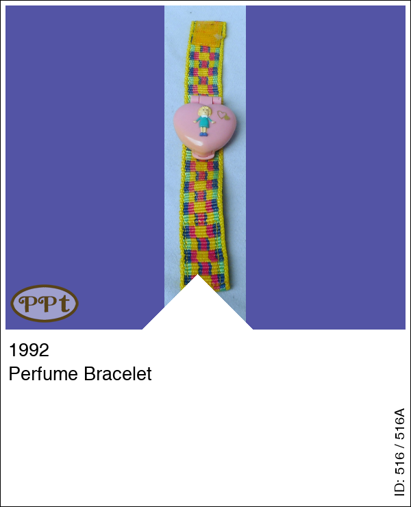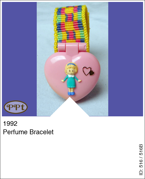 Deze armband met leuke kleurtjes is versierd met een roze hartjes doosje met aan de voorkant een afbeelding van Polly in groen jurkje. In dit doosje heeft een parfum-creme gezeten en de binnenkant van het doosje is geel. Er horen geen poppetjes bij.