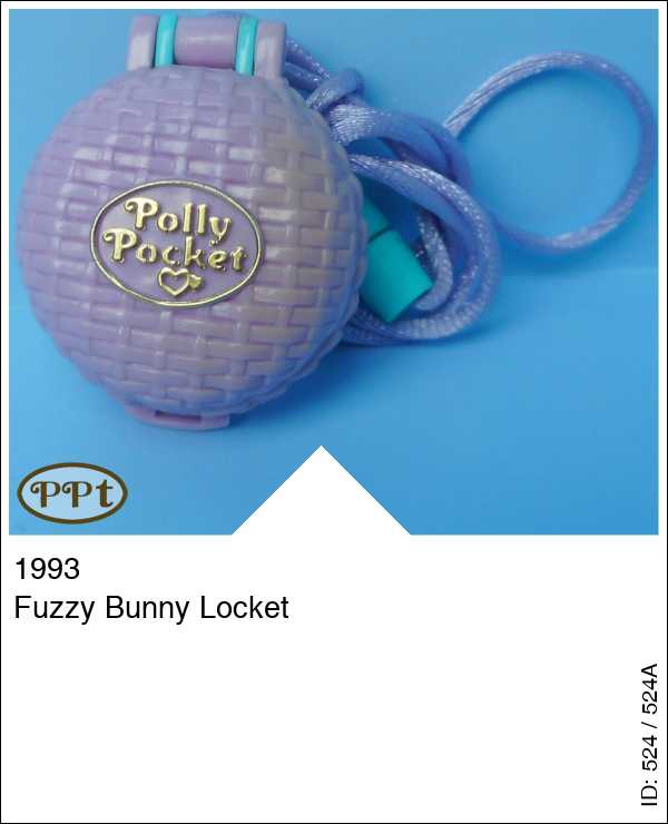 Een halsketting met een paars doosje eraan. Binnen in is aan de ene kant een bankje en je kunt hier een foto achter doen. Aan de andere kant zie je een paar kussens en een geel konijnenhok met een bruin konijntje. Compleet met Polly en konijntje Hutch.