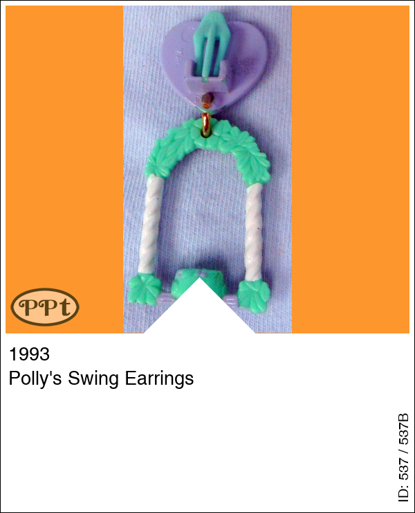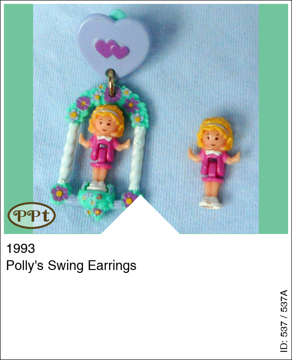 Polly's Swing EarringsUpdate: 17-02-2023 Paars hartje waarop 2 kleine paarse hartjes zitten en hieronder hangt een prieeltje aan met bloemetjes waar Polly in kan staan.