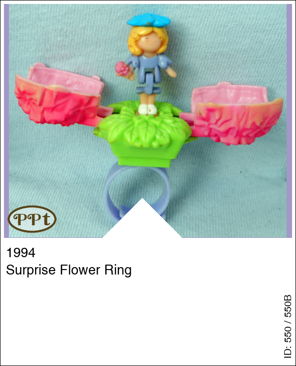 Een paarse ring met een roze bloem erop en binnenin zit Polly met een bloem in haar handen en een blauw petje op en dit petje zie je aan de buitenkant bovenop de bloem.
