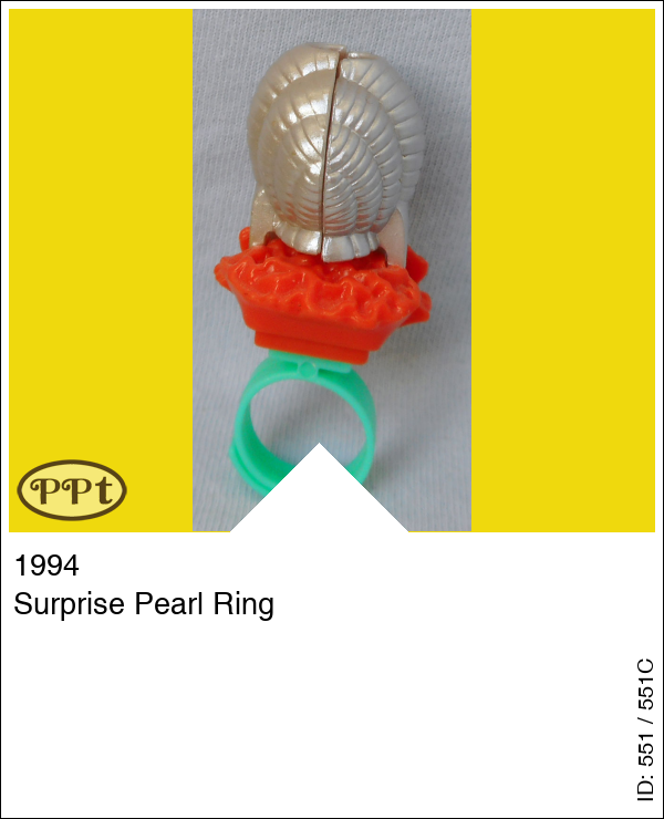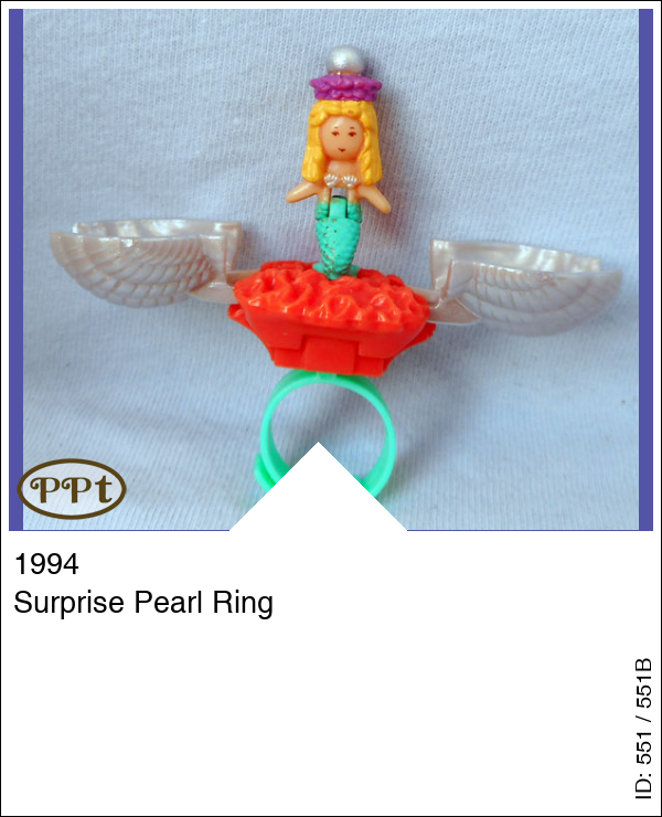Surprise Pearl RingUpdate: 12-03-2023 Deze groene ring heeft een paarse schelp bovenop, deze kun je ook openklappen en dan zie je hier Mermaid Polly. Met Mermaid Polly.