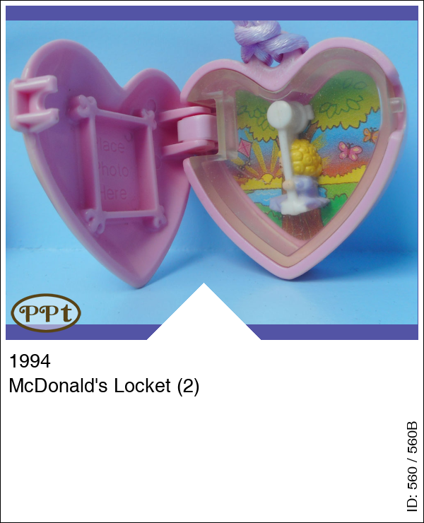 Dit is een halsketting met een roze hartje. Dit kreeg je bij McDonalds bij je Happy Meal. Binnen kun je links een foto doen en rechts is een schommeltje met Polly erop en je ziet op de achtergrond een boom en vlinders en een ondergaande zon.