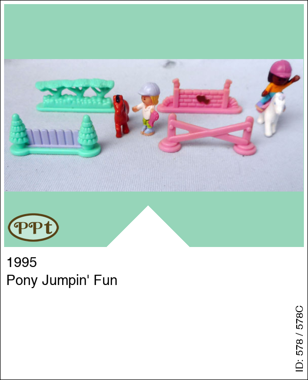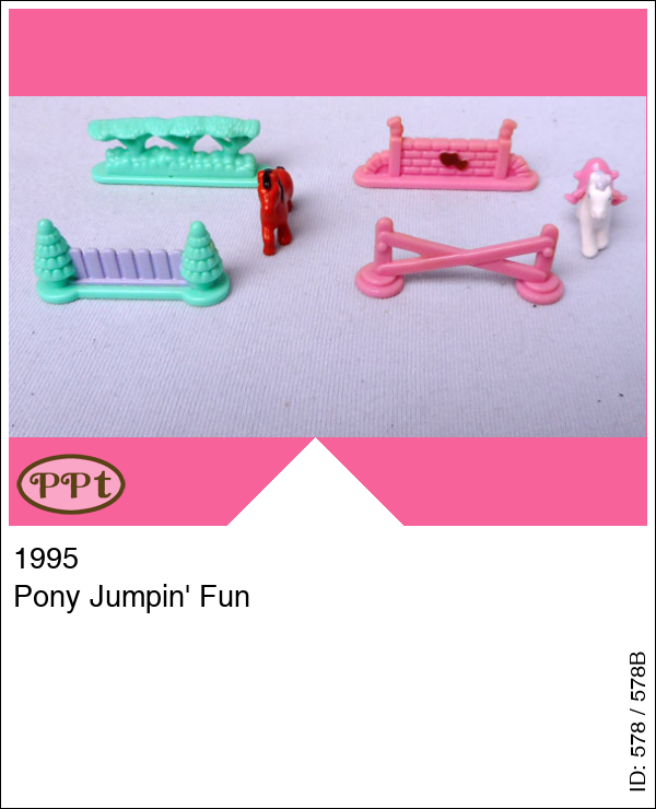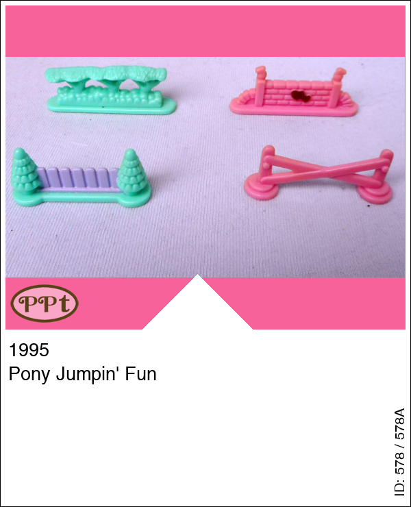 Dit zijn 4 verschillende spring hekjes, 1 blauwe met boompjes, 1 blauwe met 2 boompjes en een paars hekje ertussen, 1 roze met gekruiste palen, 1 roze muurtje met gouden hartjes. Het bruine paardje kan erover heen springen en het witte paardje met paarse staart en paarse manen en roze zadel kan er ook overheen springen.