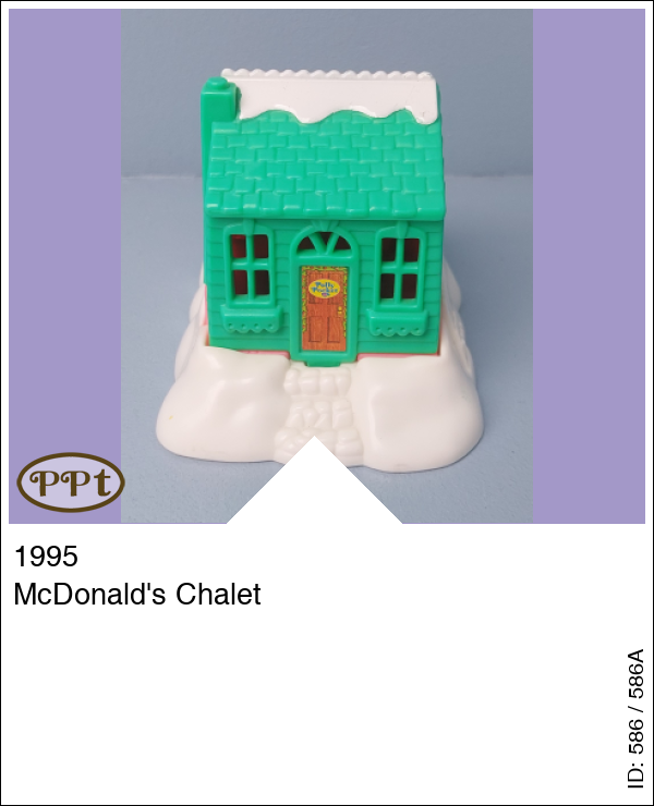 Leuk klein alpine huisje op een besneeuwde ondergrond. En binnenin is een lekker knus huisje met wat stickers en daarop is een afbeelding te zien van een besneeuwde helling met een persoon die naar beneden ski, en een plaatje met kerstboom en kado's, ook ligt er een hondje voor de open haard. Er staat een polly vast in en dit popje beweegt als je aan het wieltje draait onder het huisje.