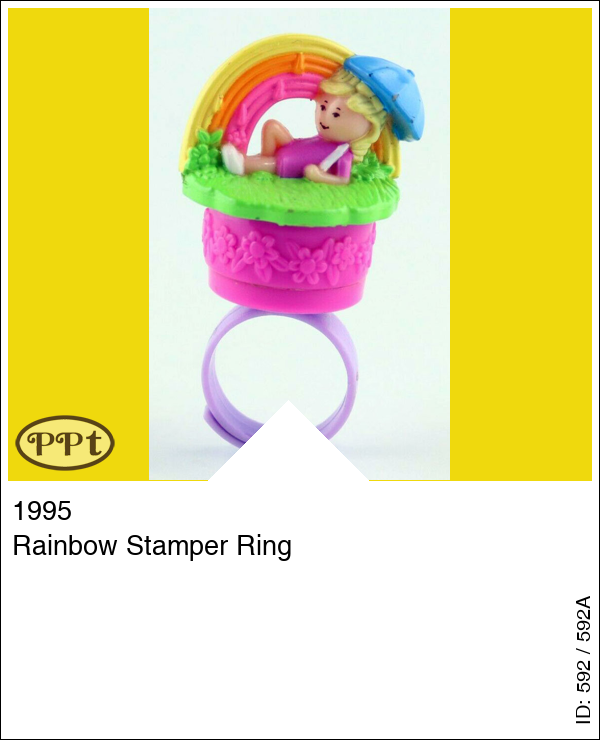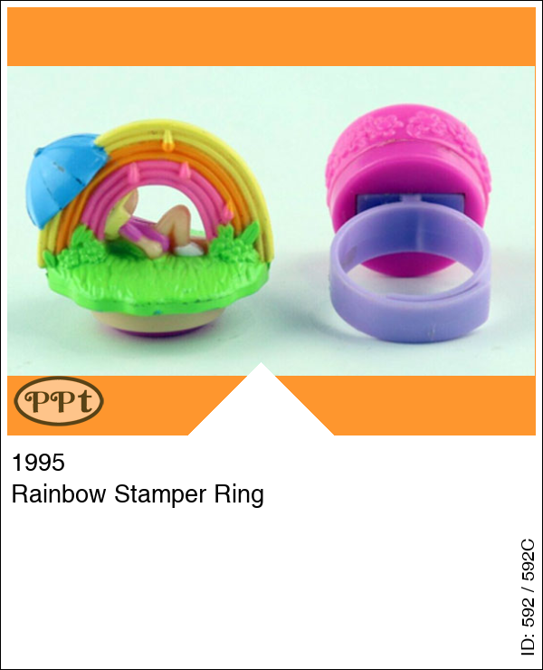 Rainbow Stamper Ring Super leuke ring met Polly liggend op een grasveld met blauwe parasol en je ziet een regenboog. De stempel is een afbeelding van een regenboog.
