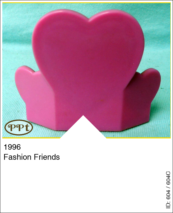 Dit is een roze kaptafel waarvan de spiegel een hartje is en je kunt er een popje voor zetten op een schijfje wat je kunt ronddraaien. Aan beide kanten van de spiegel is een soort van paspop waar je de rokjes en de hoedjes op kan zetten.