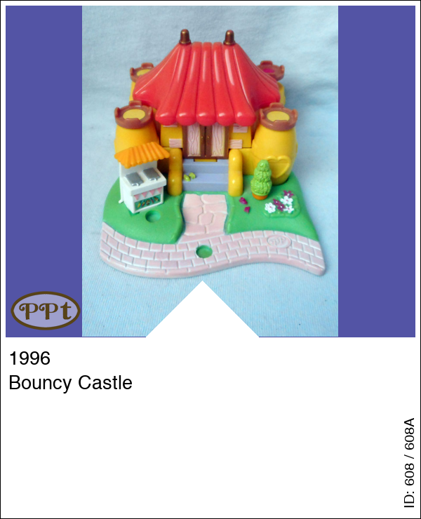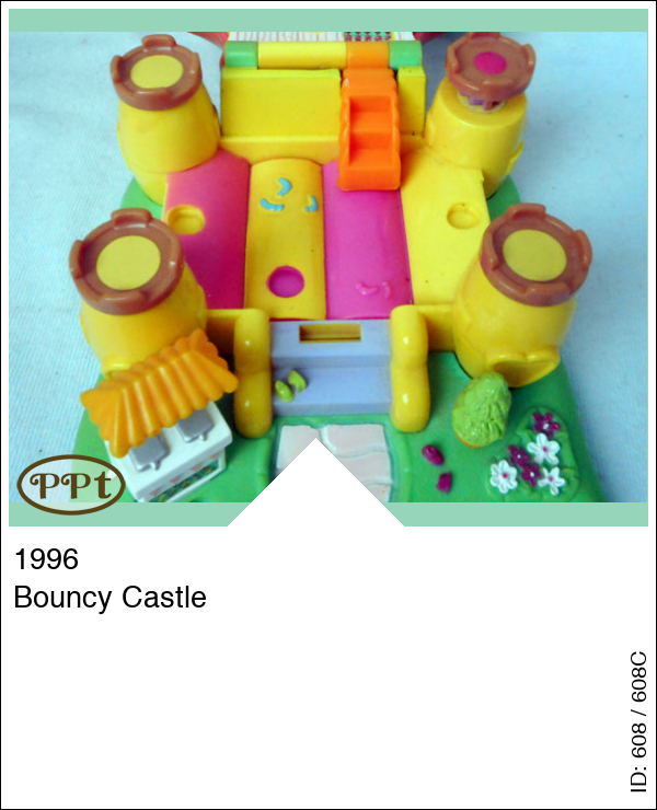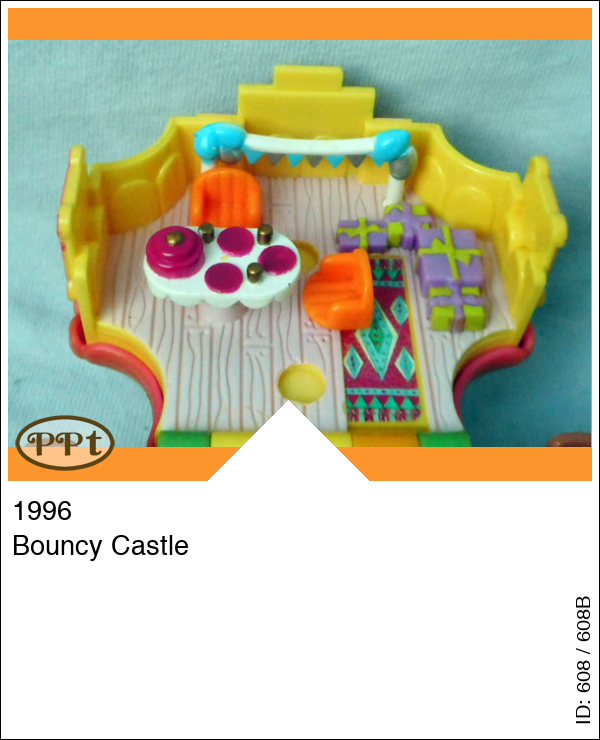 Leuk huisje in de vorm van een kasteeltje met daarbinnen een springkussen en als je op het achterste torentje drukt dan kan Polly op de trampoline springen. Bovenaan is een feestje met een gedekte tafel met taart en er liggen cadeautjes op de grond. Buiten staat een ijsco karretje.