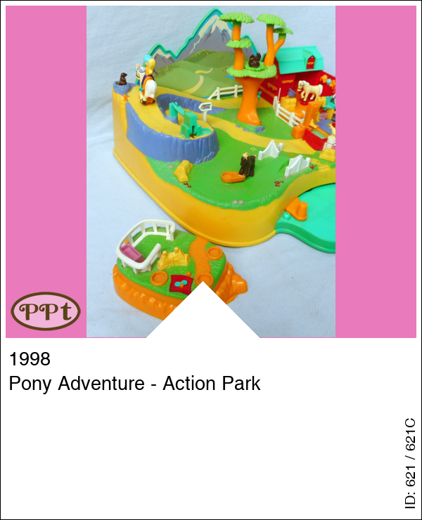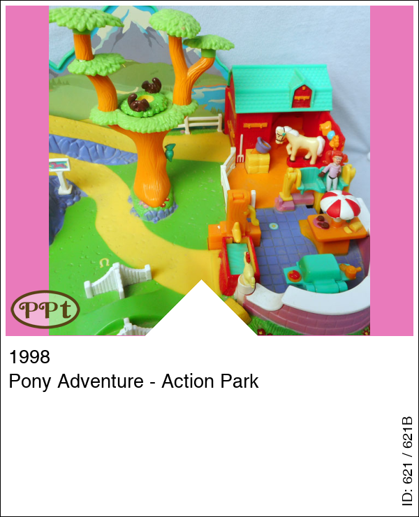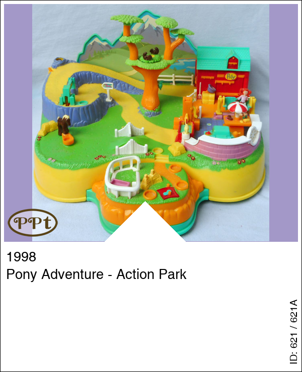 Een landschap in de bergen waar een manege staat. Wanneer je met magneet Polly gaat paardrijden dan beweegt alles b.v. de eekhoorns in de boom en specht, het paardje in de wei, de slagboom gaat omhoog en er komt een diertje uit een holletje, je rijd het paard in de stal en deze komt er aan de andere kant weer uit zonder Polly. Die gaat lekker barbequen. Ook heb je nog een los stukje wei en daaronder zit het hendeltje verborgen waarmee je Polly door het land hebt laten lopen. Met Polly, Lea en Lila en Polly vast op het paard.