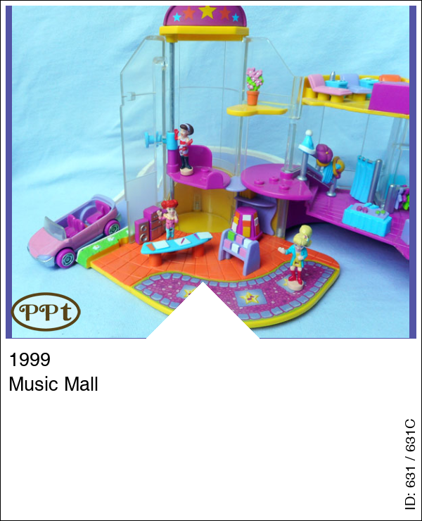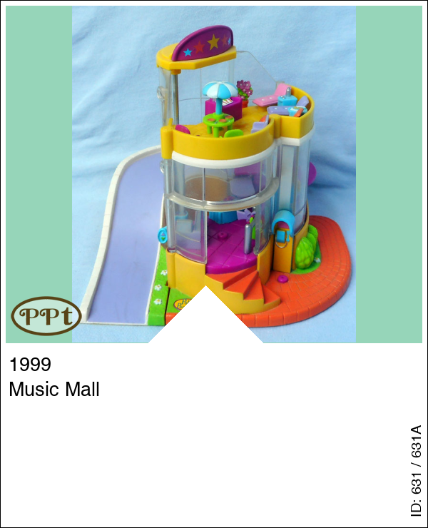 Dit is een winkelcentrum waar op de begane grond boeken en muziek verkocht worden, als je met de lift omhoog gaat naar de volgende verdieping dan kom je bij de kledingwinkel waar hoedjes, jurkjes en schoenen verkocht worden. De volgende verdieping is het dakterras waar je 3 ligstoelen staan en een tafel met 3 stoeltjes en een vrieskast met ijsjes waar je de deksel van open en dicht kan doen. Je kunt met de paars/roze auto de helling oprijden van het winkelcentrum. Met Polly, Lila en Lea.