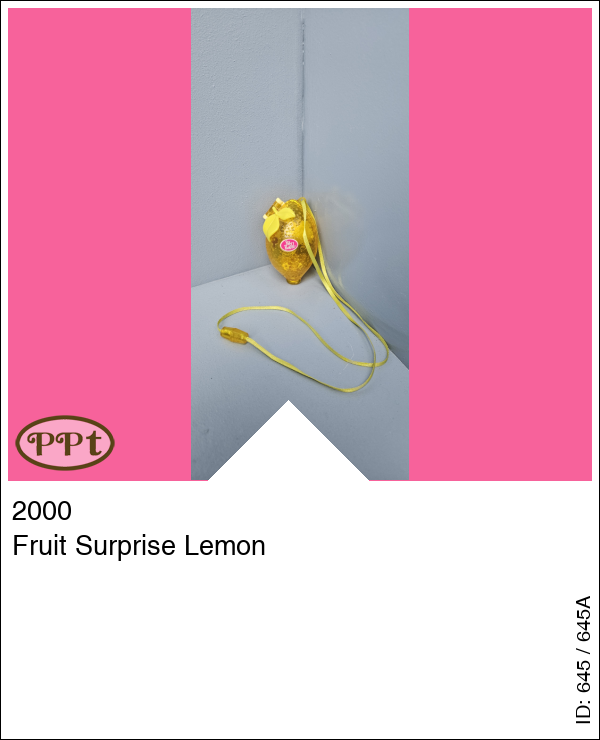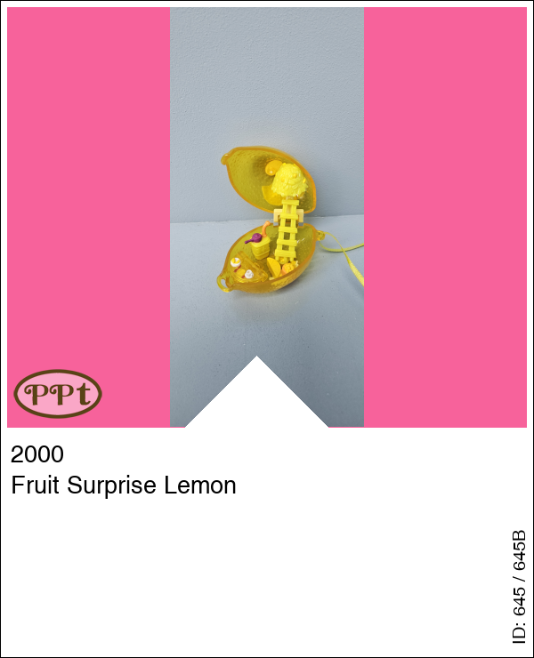 Dit is een halsketting met hieraan een citroen. Binnenin zie je boompje en dit kun je openklappen en hieronder zit een picknick kleedje onder. In de citroen zie je een tafel wat je open kan klappen met verschillende spulletjes erop. en op de grond staan wat mandjes met citroenen. Met Polly in haar rokje en de gele ladder.