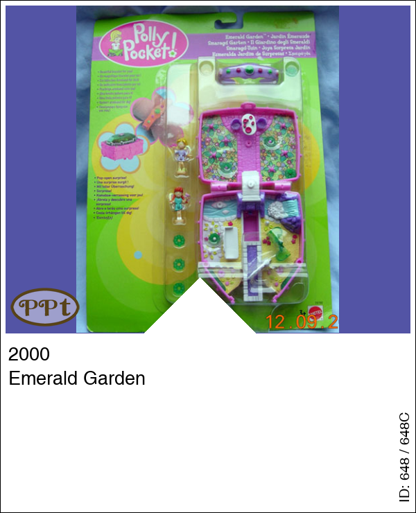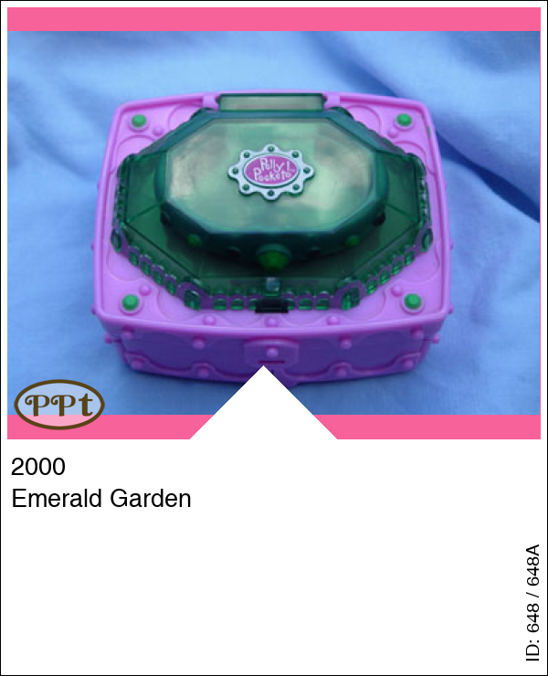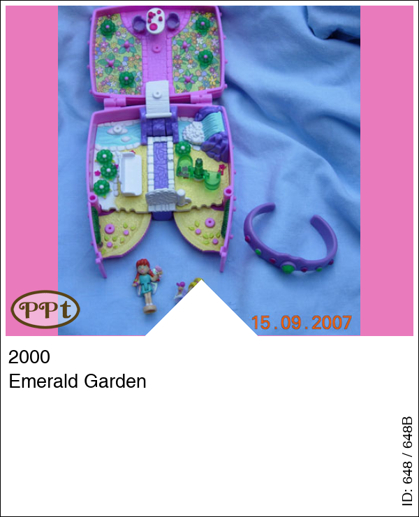 Dit vierkant doosje met bovenop een groen dakje en als je dat optilt zie je een armband. In het doosje is een tuin met bruggetje en waterval en bankje. De voorkant kun je uitklappen en als je onder het bruggetje drukt gaat het padje open. De bloemetjes kun je anders wegzetten. Met Fairy Polly en Fairy Lea en 8 groene bloemetjes en het paarse armbandje.
