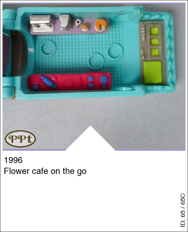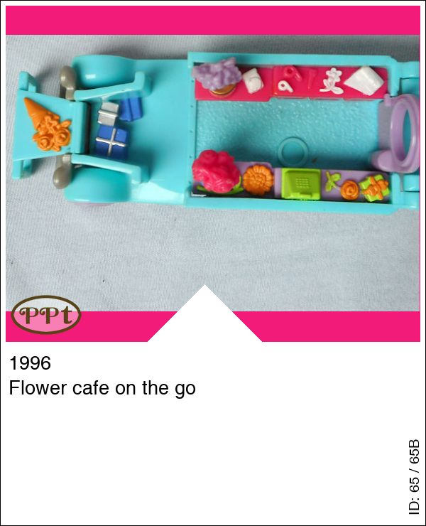 Dit is een blauwe ouderwetse bus als bloemen shop en cafe on the go. In de bloemenwinkel staan enkele bloemen, plantjes en een inpakbalie. Ook een kassa om je bloemetjes af te rekenen. Aan de andere kant van de bus kun je lekker koffie bestellen met taart en op de picknicktafel opeten. Onder de motorkap liggen cadeautjes. Met Polly, Cathie, picknicktafel.