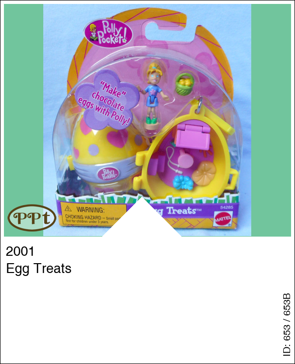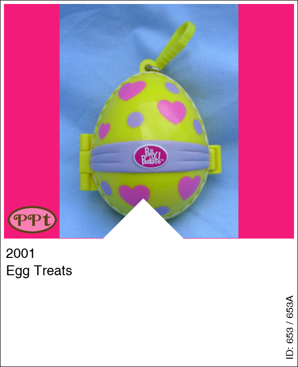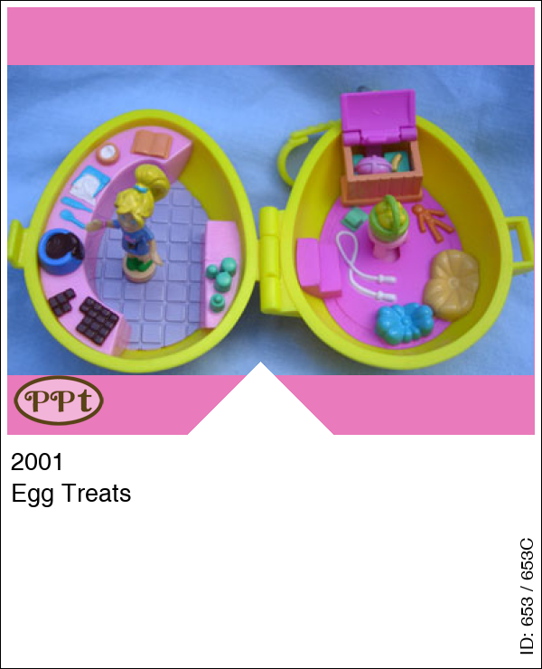 Dit gele ei met aan de buitenkant een lila strik en rose hartjes is een sleutelhanger. Binnenin zie je dat ze hier chocolade aan het maken zijn en aan de andere kant liggen 2 kussens en staat een krukje en als je het krukje verschuift gaat de deksel van de kist open. Met Polly en het mandje met daarin de eitjes.