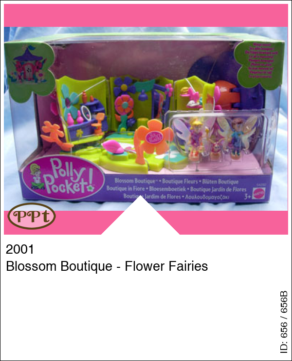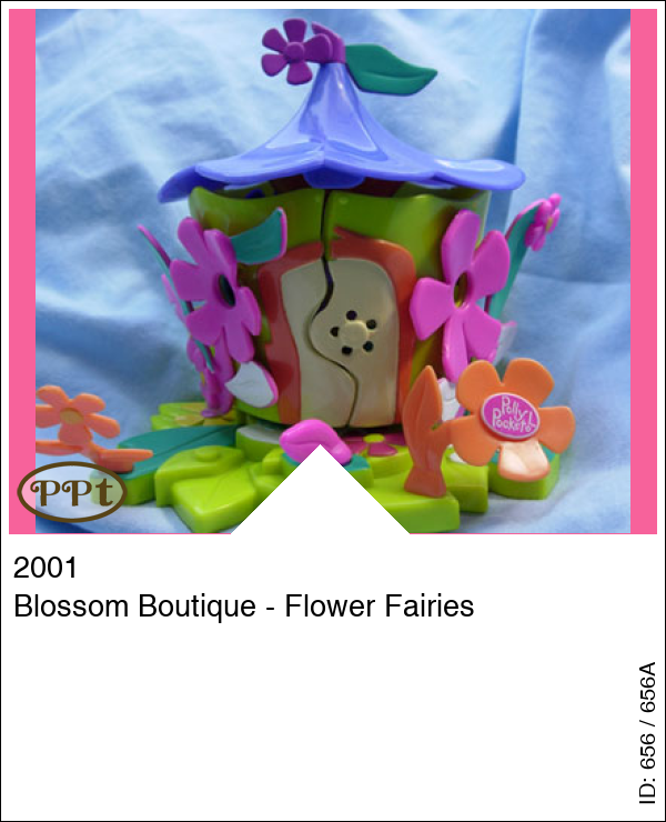 Deze bloem heeft ook iets geweldigs binnenin, het is namelijk een boutique. Met o.a. een kledingwinkel een parfum/kapper winkel en in het midden een showroom met grote spiegel en wanneer ze hiervoor gaan staan op het speciale vakje dan beweeg je met een schuifje en de vleugels beginnen te bewegen van blijdschap geweldig om te zien. Onder de paarse bloem zit nog een vakje en daaronder is een bedje verstopt. Met fairy Polly en fairy Lila en een klein lieveheersbeestje.