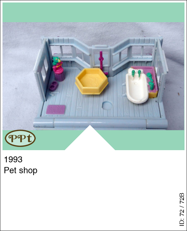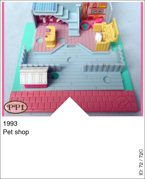 Een huisje waar binnen een dieren winkeltje is. Met een toonbank. Onder de trap zie je vogelkooitjes. Ook zie je een konijntje in een hokje. Bovenin staat een papegaai en een ligbadje.