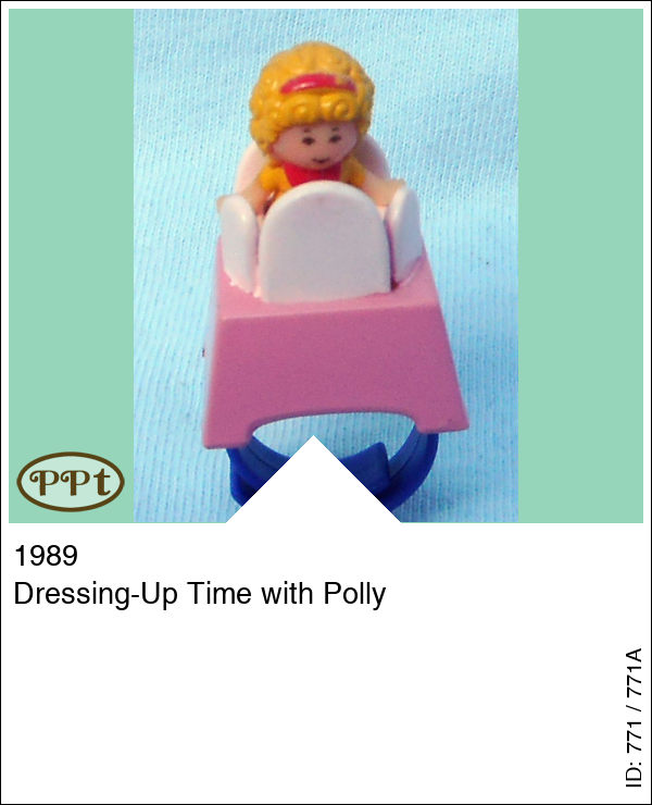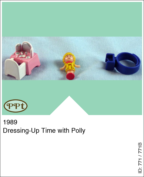 Dressing-Up Time with PollyUpdate: 15-02-2023 Leuke blauwe ring met een roze kaptafeltje met daarop allerlei spulletjes. Met Polly.