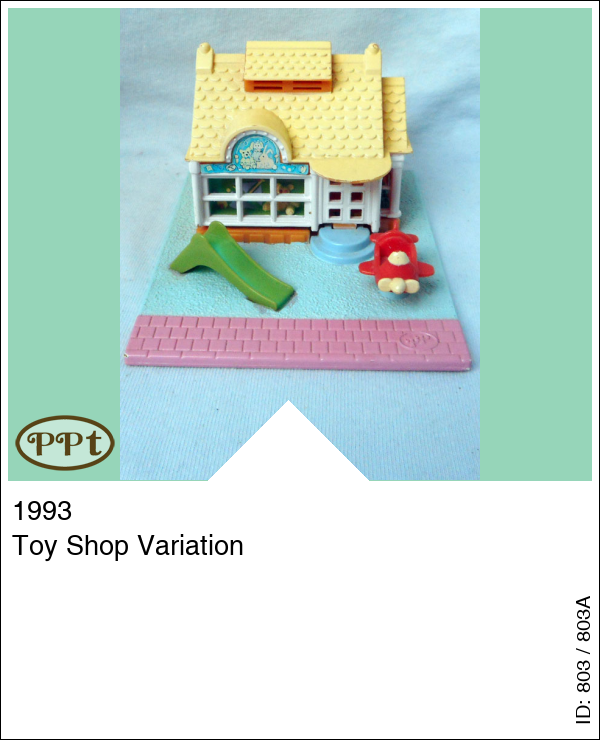 Een speelgoedwinkel met een toonbankje waar speelgoed op ligt, via een trap ga je naar boven waar een schommelpaard staat, een racebaan, een poppenhuis en een kast. Aan de buitenkant van het huisje zie je een glijbaantje en een vliegtuigje. Ook is er een etalage waar wat speelgoed in ligt o.a. een beertje. Met Polly en Mimi.