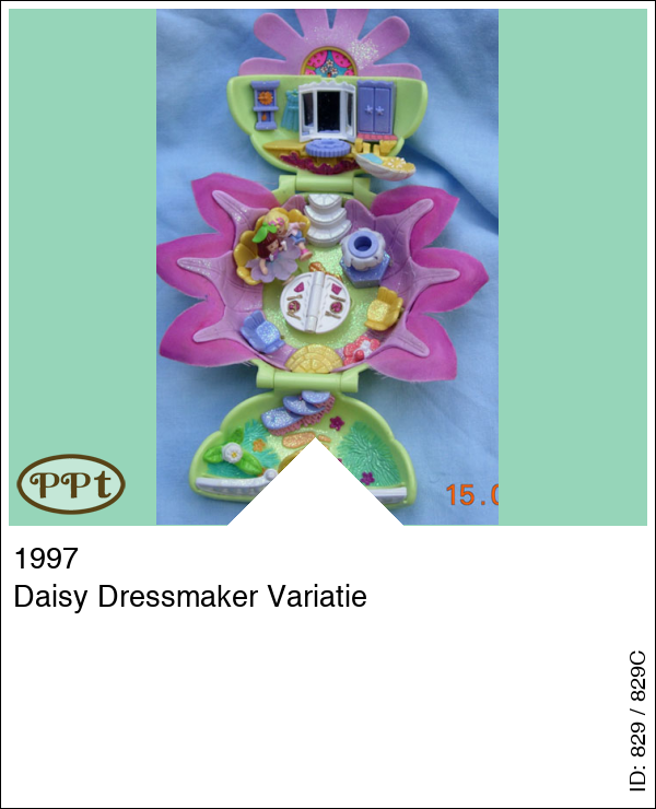 Deze leuke bloem met glitters verschuilt binnen een geweldig wereldje. Aan de ene kant zie je een tuintje en aan de andere kant een slaapkamer met spiegel, klok, bed, kast. In de midden van de bloem is een zithoek met overal glitter stoeltjes en gedekte tafel welke je eraf kan halen en aan de ander kant is weer de kniptafel. Met Polly, Daisy in paarse rokje en een los wit rokje en los geel rokje en Daisy in wit rokje.