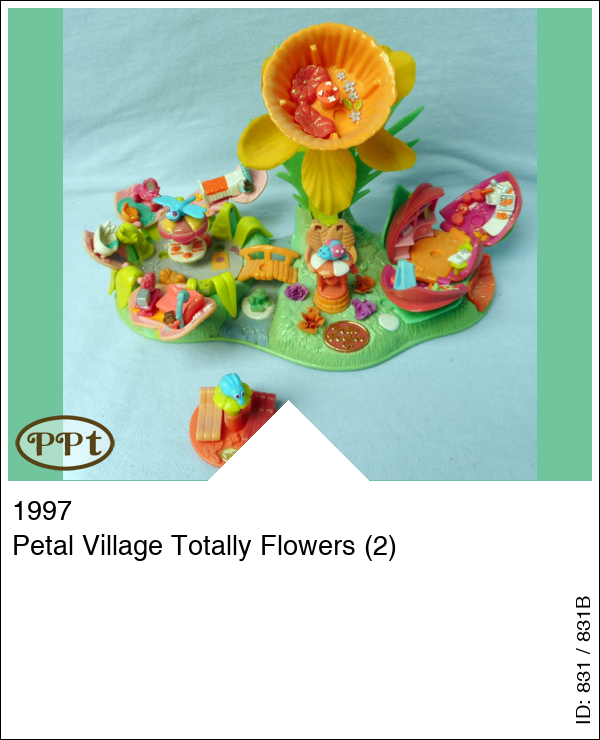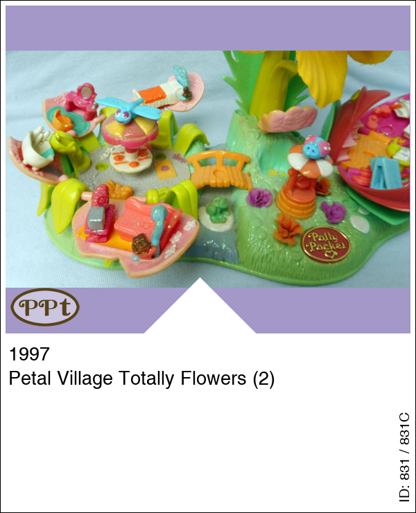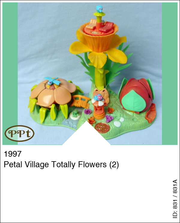 Dit zijn 3 bloemen en overal zie je glitters en kleine bloemetjes en een bruggetje over een slootje en onder de middelste bloem zit een bankje en daaronder zit een vakje. De eerste rose bloem kun je openklappen en onder elk bloemblaadje zit iets anders, een bedje, sofa met lamp en tv, een badje met wastafel en een kaptafel, in het midden is een picknicktafel met parasol allemaal met glitters. De rechtse bloem kun je eraf halen en openklappen en daaronder zit een kinderschooltje met verfspulletjes. De middelste bloem kun je naar beneden klappen daar zie je een bloemenzitje met tafeltje. Met libelle, de bij en het bovenkantje van de middelste bloem.