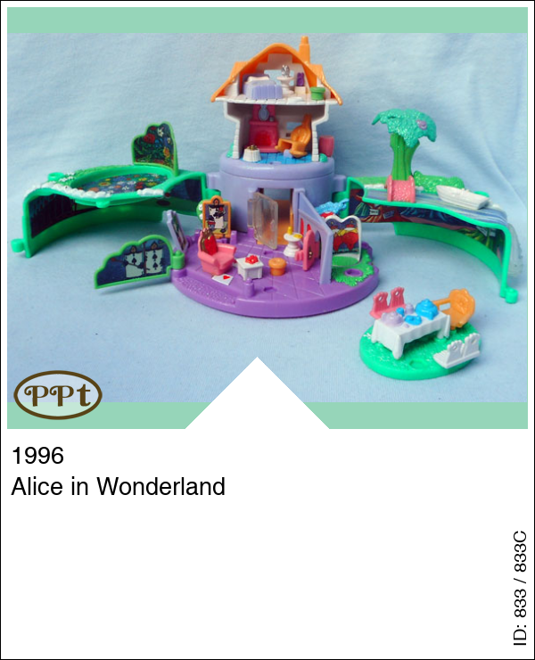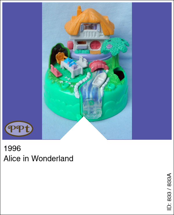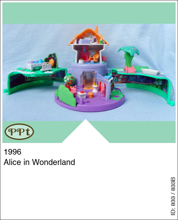 Een heuvel met daarop het witte huisje van wit konijn. Je ziet een watervalletje met roze bruggetje, wit bootje en een mooie glitterboom met de kolderkat, naast de boom een kuil waar je door kan springen en de theetafel met daaronder de bloementuin. Het huisje kan je omdraaien en daar zie je een schommelstoel, openhaard en een slaapkamer. Aan de achterzijde zit het konijnenholletje waar Alice doorgaat en dan komt ze terecht bij het tafeltje met de krimpkoekjes en de 3 deurtjes. Je ziet ook de rozentuin en de kaarten. En aan de andere kant zie je de rups, de tweeling en het bos met de kat.