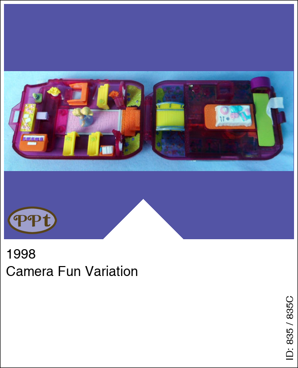 Fototoestel van doorzichtig rood/roze en als je op het knopje drukt brand er een lampje.