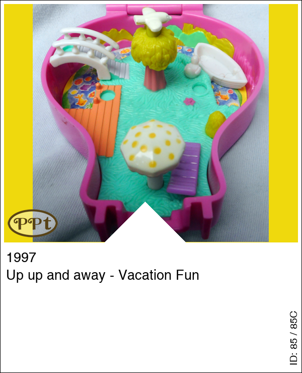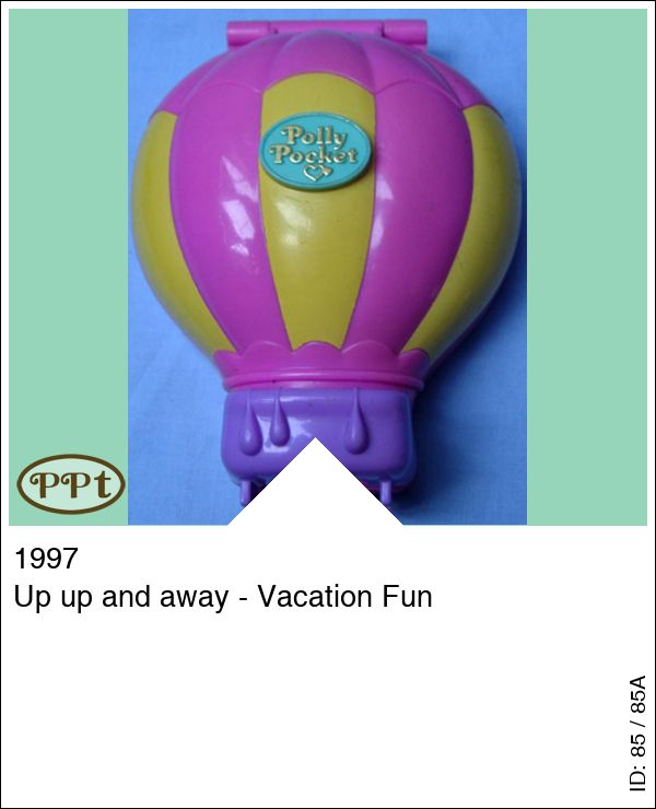 Up up and away - Vacation FunUpdate: 01-06-2023 Een luchtballon met een kleinere ballon en daarbinnen is een tuintje met beneden een vijvertje met bootje en een vogel op de boom. Met Polly en Lauren, de kleine ballon en het picknicktafeltje.