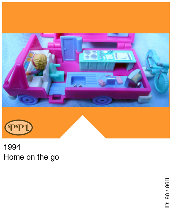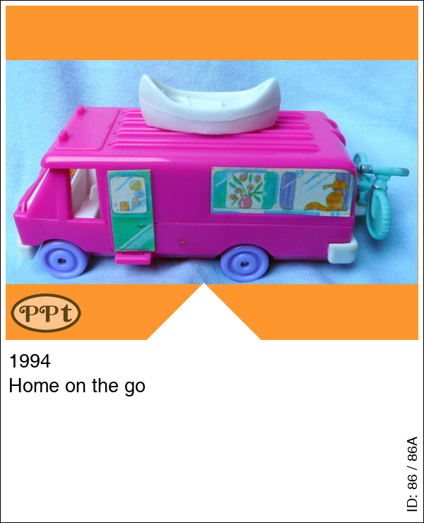 Een busje met daar binnenin een keuken, slaapkamer, douchebak en een picknicktafel. Het poppetje kan haar beentjes uit elkaar doen voor als ze een ritje gaat maken op de fiets.