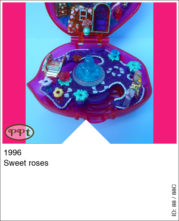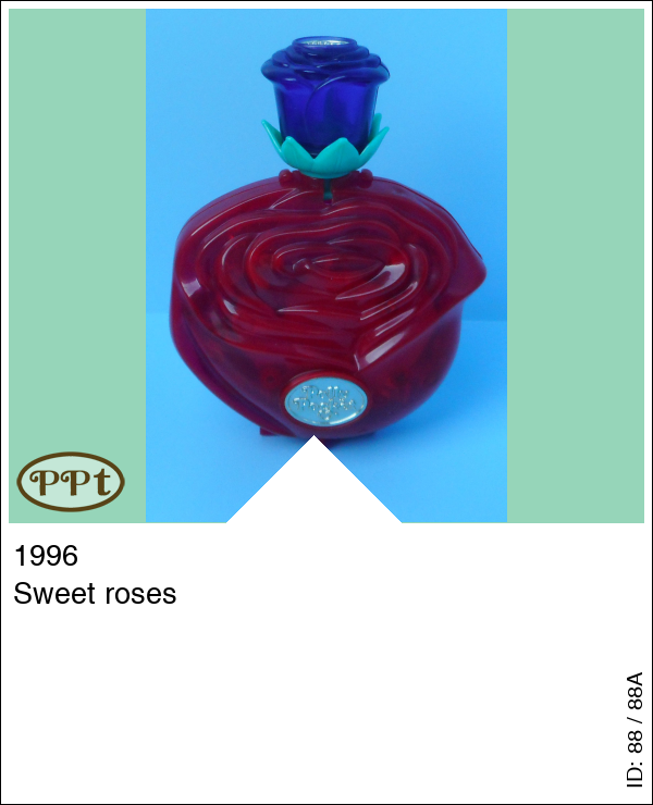 Een flesvorm met daarin een tuintje, beweegbaar visje en schommelstoeltje. Je kan in het dopje parfum doen en door het stokje eruit te halen de parfum smeren. Met Polly en 2 rode bloempjes en rode bloemvaasje en blauw bloemvaasje en 2 paarse bloempjes en 1 blauw bloempje.