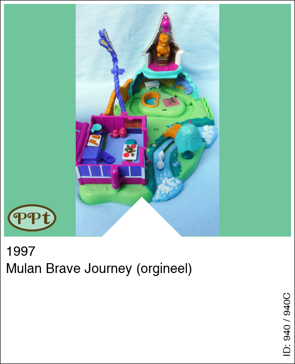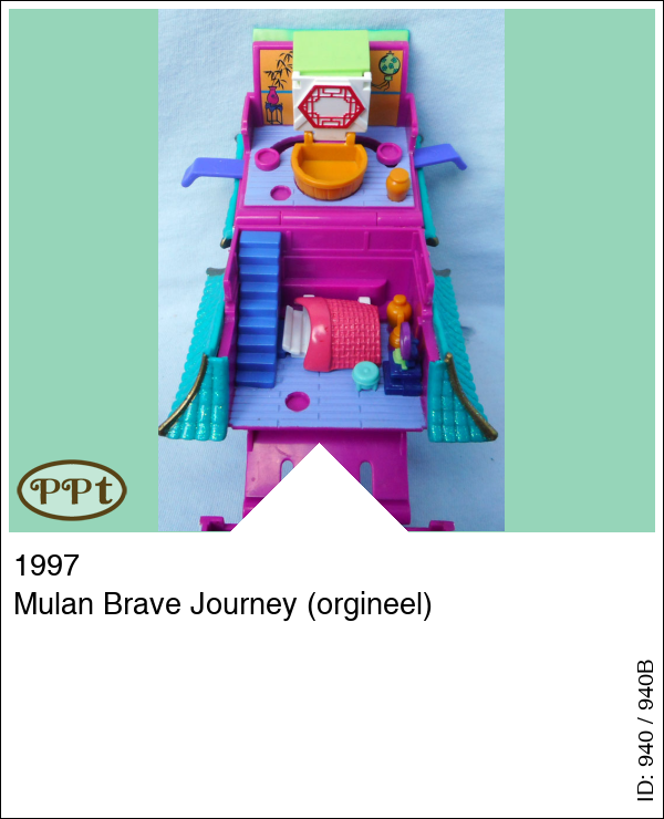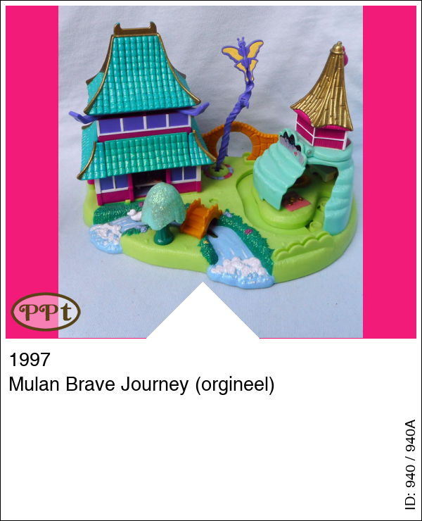 Een geweldige glitterende disney pocket. Voor de huisjes ligt een glitter rivier met eendjes en brug (de eendjes bewegen als je het boompje draait). Je ziet een vlinder vlieger met gele stukjes. Het rechtse huisje kan je omdraaien en dan zie je een draak, vijver met vissen waar ze omheen kunnen lopen en dan veranderen de vissen en een bankje. Het grote glimmende huis kan je in 2 gedeelten openklappen en daar is beneden een restaurant gevestigd. Een verdieping hoger is een slaapkamer met kaptafel en bed met beweegbare deken, ga je nog een trapje hoger dan is daar een soort van badkuip maar je kan het dichtdoen en er ook een kast van maken waar Mulan zich kan verkleden. Met 2 x Mulan in verschillende jurken, grootmoeder, Kapitein Shang, Mushu het draakje, Khan het paard.