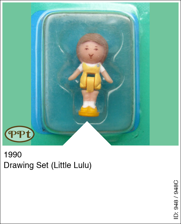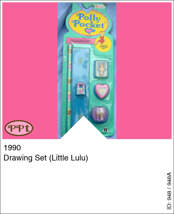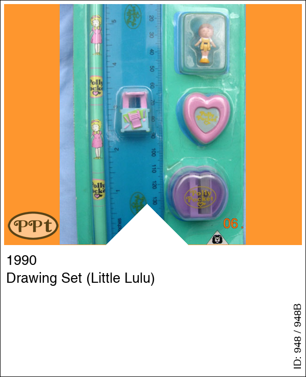 Dit is een schrijfset met Little Lulu, en bij haar zie je een lineaal met daarop een tafeltje en dit zit er vast op, gum (hartje), potlood en een puntenslijper.