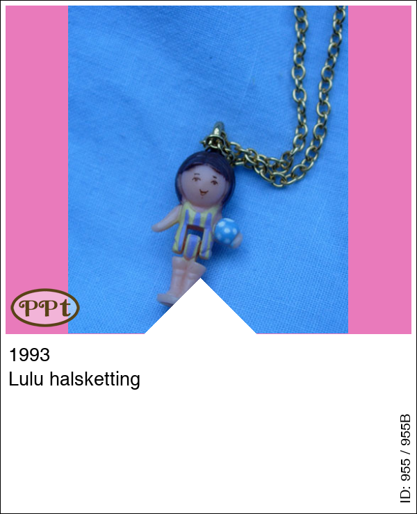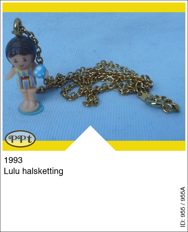 Leuke halsketting met daaraan lulu uit Beach Cafe 1993, ze heeft een bal in haar hand en een geel/blauw gestreept badpakje. Deze ketting kreeg je bij sommige verpakkingen van items van Polly Pocket er gratis extra bij.