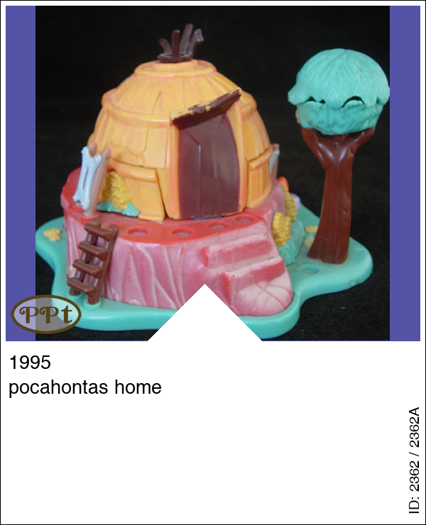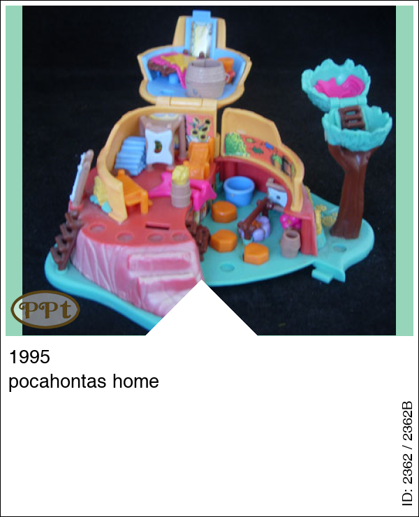 Het tentje van Pocahontas met aan de binnenkant allemaal kleine prulletjes en een bedje en berenvel, naast het tentje staat een boompje welke je open kan doen en daarin zit een vel om op te liggen. John.
