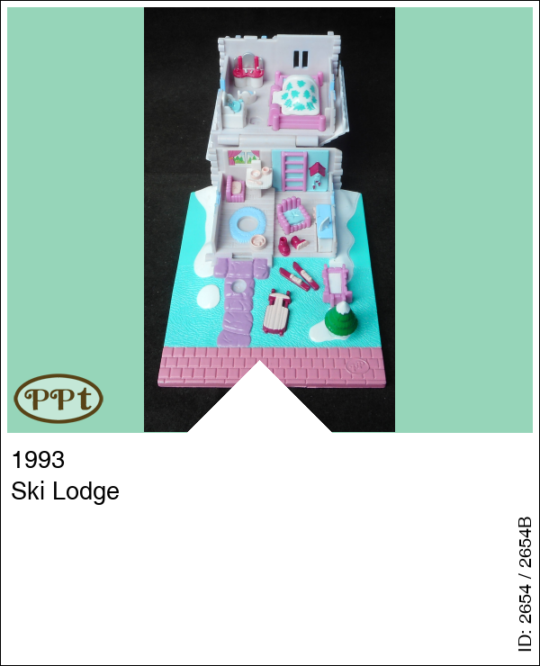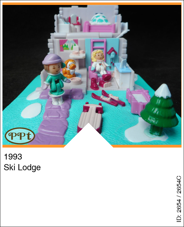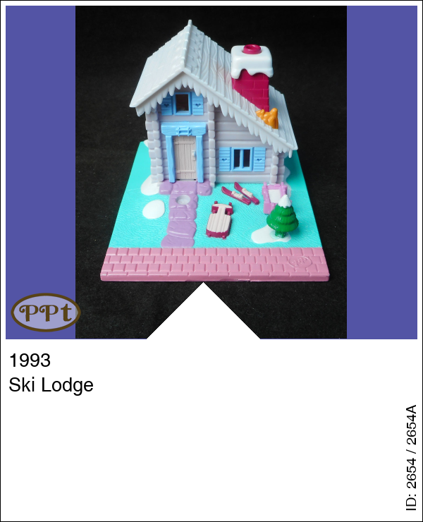 Een skihuisje met op dak een eekhoorn. Buiten zie je een slee, ski's en een dennenboom. Binnen zie je een woonkamer met open haard waar een stoel voor staat en er liggen laarzen, een zithoekje en de trap naar de bovenverdieping, boven is een bedje met deken waar dennenboompjes op staan, je ziet een kaptafel en wastafel. Met Polly, Lulu en Nellie de St. Bernhards hond.