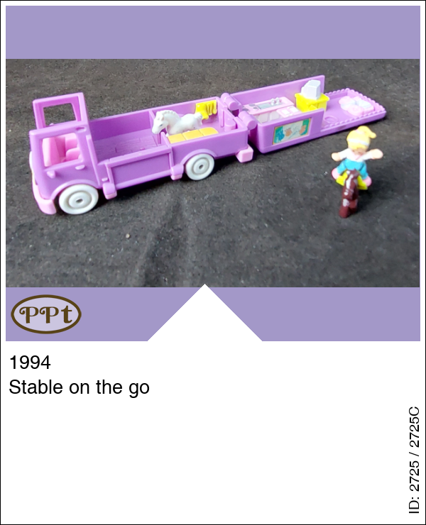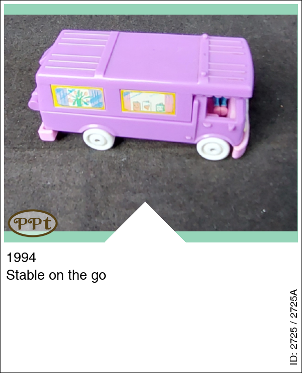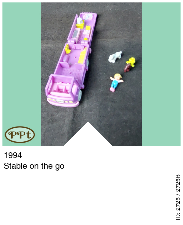 Dit is een paars busje wat paardjes vervoert. Als je het dak openklapt zie je een ruimte voor de paardjes met een klepje wat naar beneden kan en de paardjes eruit kunnen lopen, als je naar de andere zijde gaat is een kussenzithoek met tv en een keukenblokje en zithoekje met tafel en 2 stoelen. Polly en 1 wit paardje en 1 bruin paardje met geel zadel.