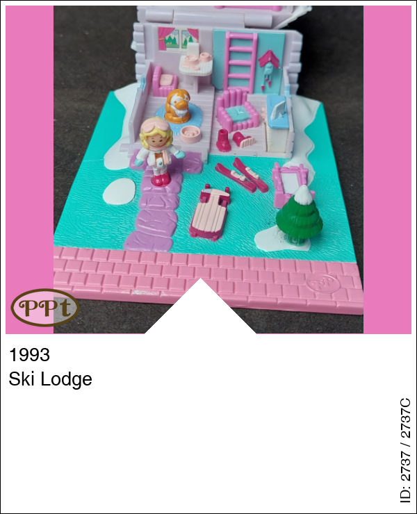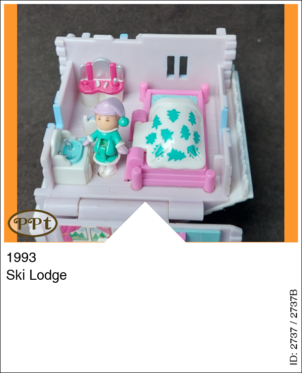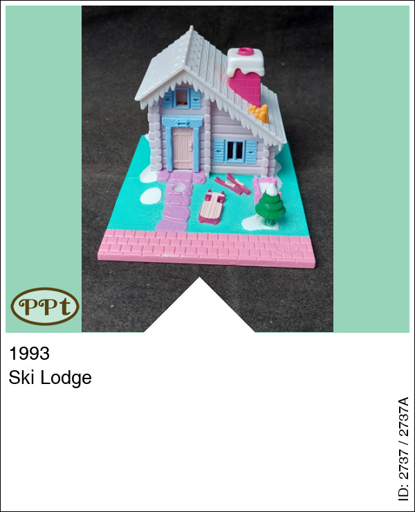 Een skihuisje met op dak een eekhoorn. Buiten zie je een slee, ski's en een dennenboom. Binnen zie je een woonkamer met open haard waar een stoel voor staat en er liggen laarzen, een zithoekje en de trap naar de bovenverdieping, boven is een bedje met deken waar dennenboompjes op staan, je ziet een kaptafel en wastafel. Met Polly, Lulu en Nellie de St. Bernhards hond.
