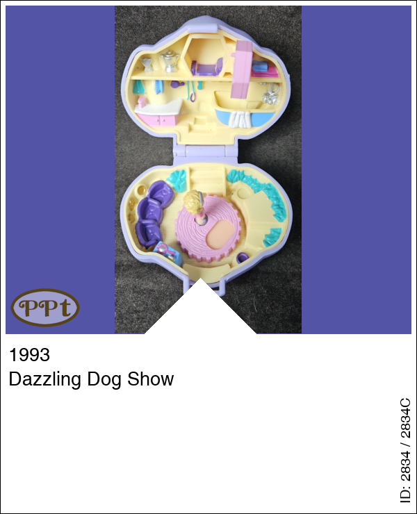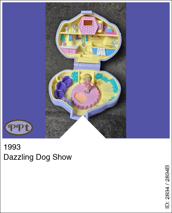 Een doosje in de vorm van een hondenkopje. Binnen in is bovenin een hondenhokje waarvan het deurtje open kan en een wasruimte voor de hond met badje. Beneden is een draaischijf waar Polly met hondje op kan staan en ze haar hond kan showen voor publiek. Met Polly.
